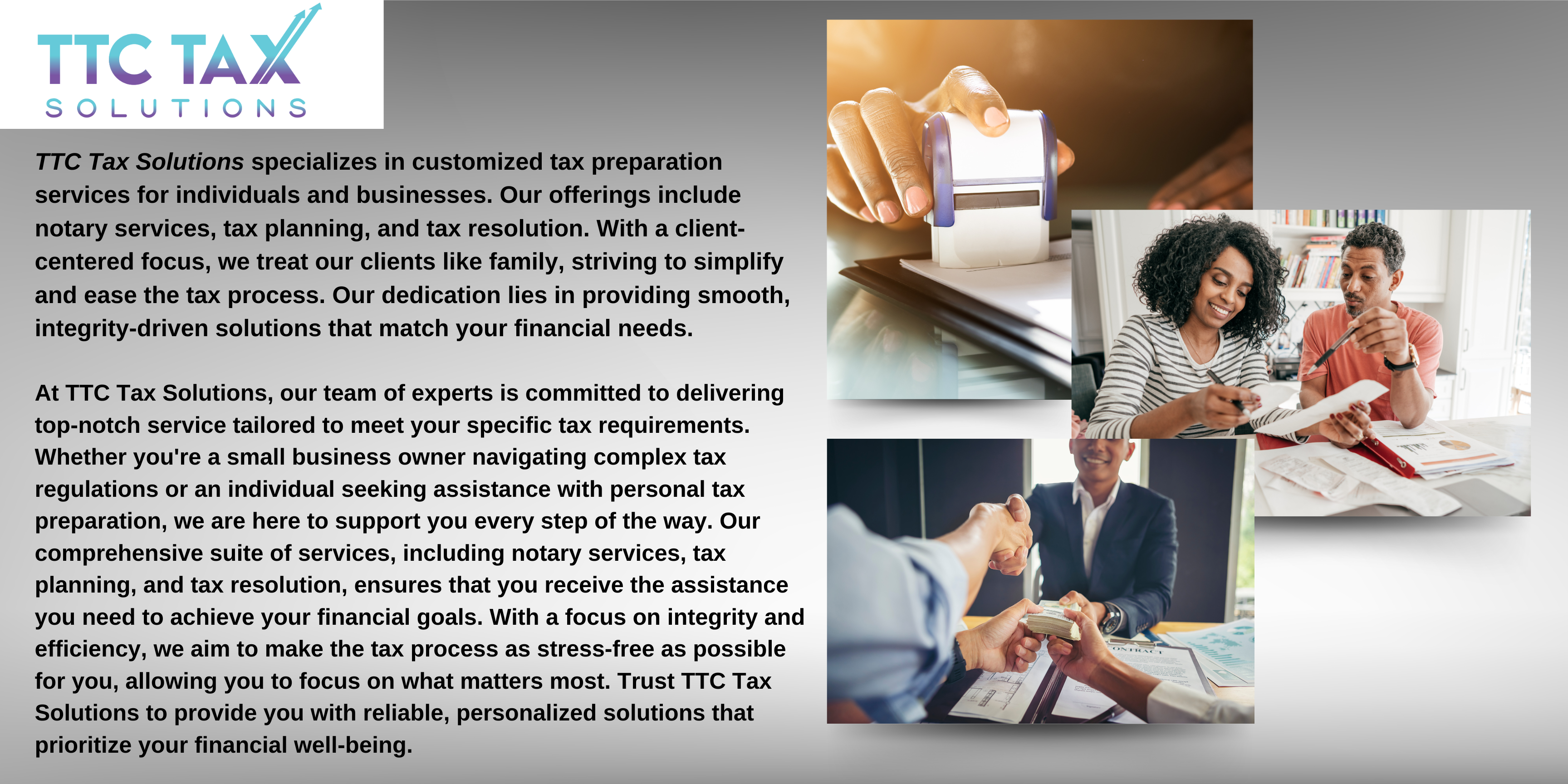 Let TTC take care of your business requirements. We are a business solutions and tax firm led by Tabitha Hall-Dunlap, a registered tax specialist and notary loan signing agent. Our focus is on delivering personalized services and essential resources to support your success. Our range of services encompasses tax preparation, notary services, and business solutions. We are thrilled to welcome all potential clients and look forward to assisting you!